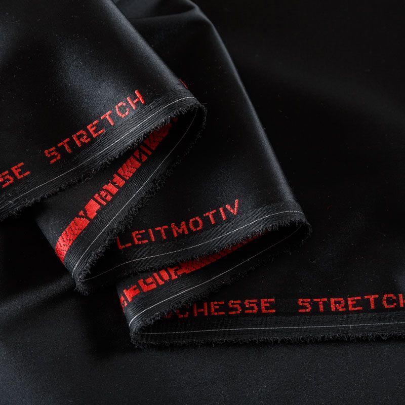 Итальянский костюмно-плательный атлас ватуссо черного оттенка. Ткань плотная, но пластичная, хорошо держит форму и отлично тянется, собирается в красивые складки и драпировки. Почти не мнется, очень удобный и практичный. Блеск умеренный, смотрится дорого, благородно. Подойдет для пошива прямых силуэтов-футляров, приталенных платьев с пышной юбкой и крупными драпировками, изделий с заложенными складками, нарядных изделий, вечерних костюмов, летнего пальто, юбки, для изготовления корсетов.