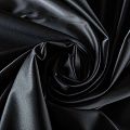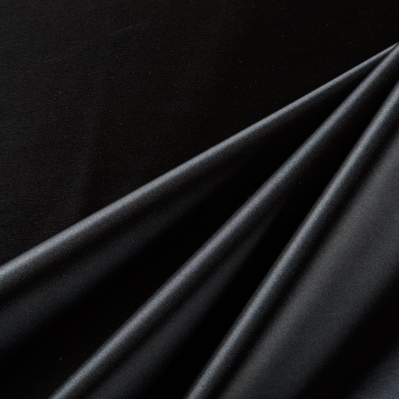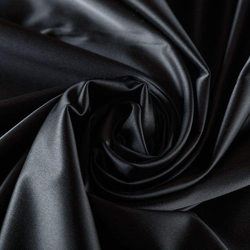 Итальянский костюмно-плательный атлас ватуссо черного оттенка. Ткань плотная, но пластичная, хорошо держит форму и отлично тянется, собирается в красивые складки и драпировки. Почти не мнется, очень удобный и практичный. Блеск умеренный, смотрится дорого, благородно. Подойдет для пошива прямых силуэтов-футляров, приталенных платьев с пышной юбкой и крупными драпировками, изделий с заложенными складками, нарядных изделий, вечерних костюмов, летнего пальто, юбки, для изготовления корсетов.