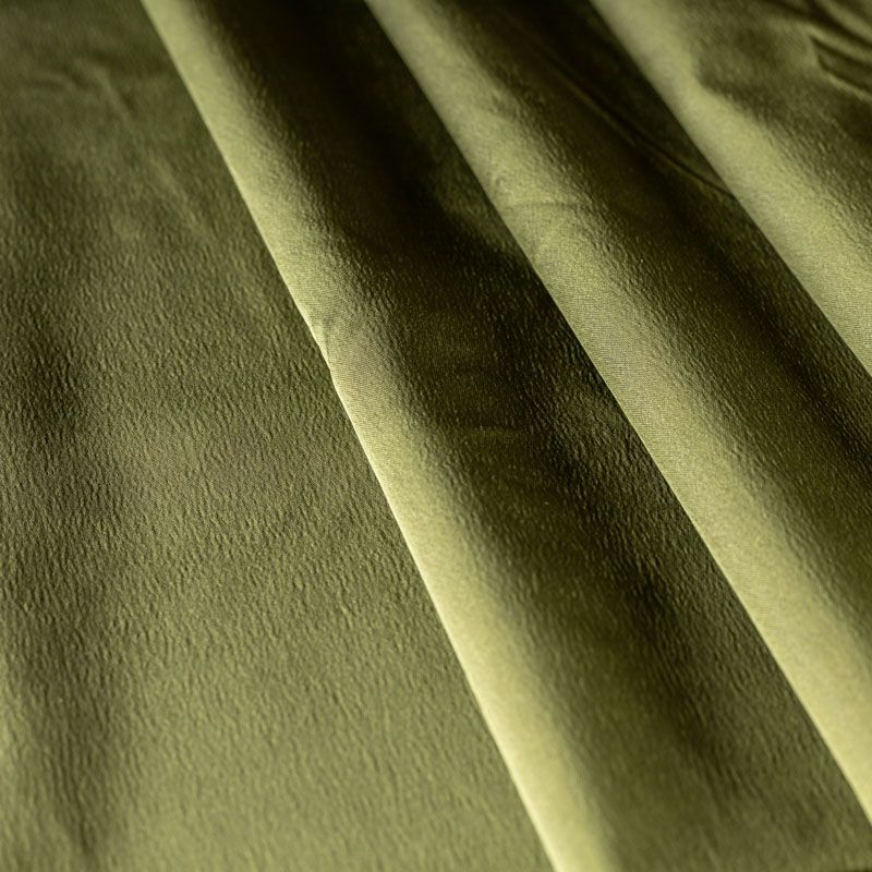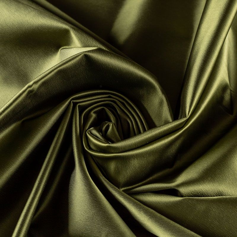 Итальянский костюмно-плательный атлас ватуссо брутального зеленого оттенка цвета хаки. Ткань плотная, но пластичная, хорошо держит форму и отлично тянется, собирается в красивые складки и драпировки. Почти не мнется, очень удобный и практичный. Блеск умеренный, смотрится дорого, благородно. Подойдет для пошива прямых силуэтов-футляров, приталенных платьев с пышной юбкой и крупными драпировками, изделий с заложенными складками, нарядных изделий, вечерних костюмов, летнего пальто, юбки, для изготовления корсетов.
