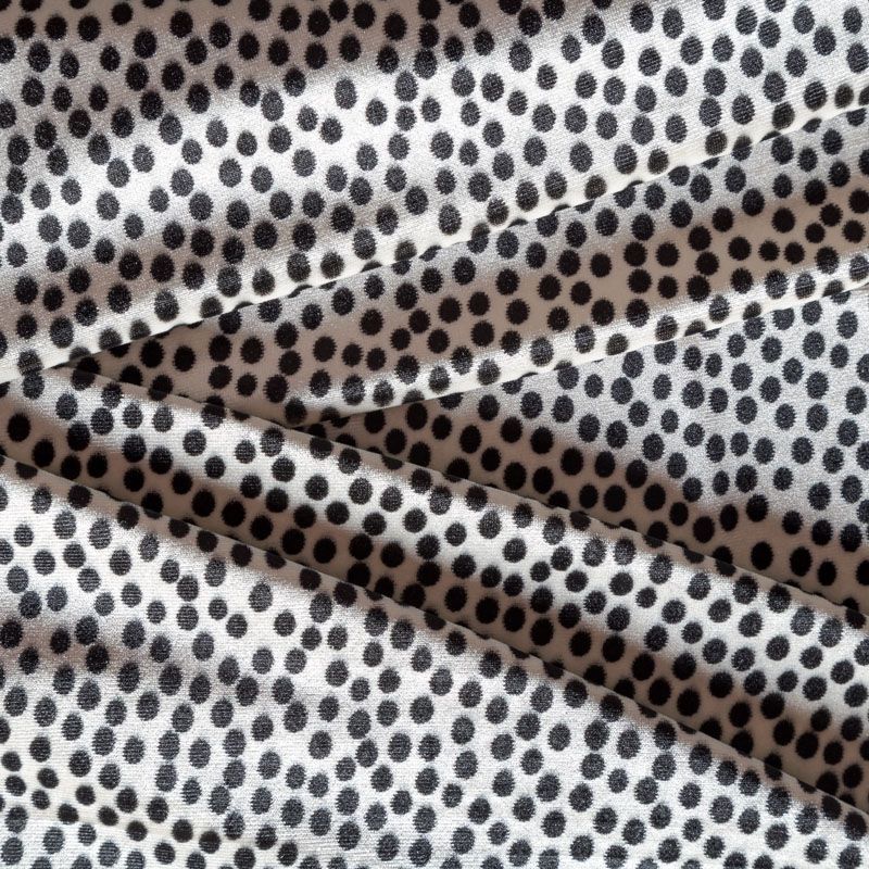 Пластичная, мягкая бархатная ткань с мелким принтом в черный горох. Ткань очень приятна на ощупь, не мнется, хорошо тянется за счет эластана в составе и драпируется. Бархат идеально подходит для пошива вечерних платьев, юбок, костюмов, а также стильных жакетов, бомберов и аксессуаров.