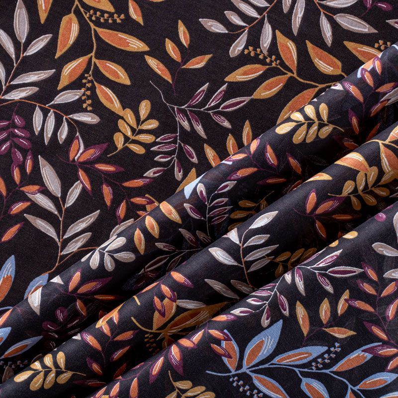 Итальянский хлопковый батист с растительным принтом в бежево-коричневых оттенках на черном фоне. Ткань очень легкая, прозрачная, приятная на ощупь, нежная, пластичная, хорошо и мягко драпируется, летящая. Батист подойдёт для модных блуз с объёмными рукавами, летних платьев и сарафанов с длинной летящей юбкой, прозрачных рубашек, декорированных объёмными бантами, туник и топов.