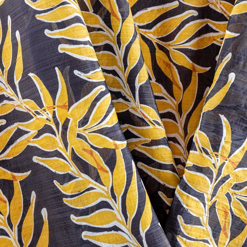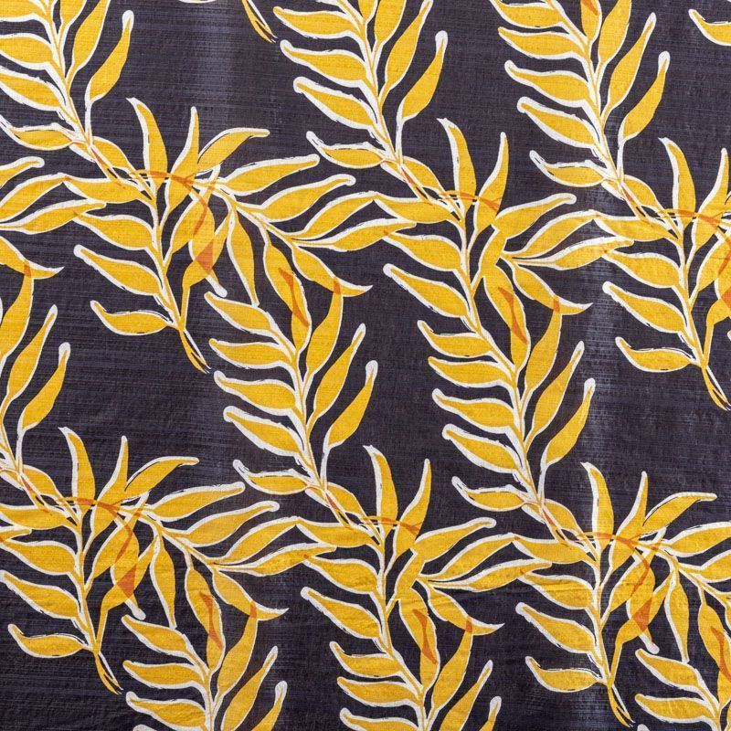 Батист с растительным принтом в молочно-желтых оттенках на темно-синем фоне. Ткань очень легкая, прозрачная, приятная на ощупь, нежная, пластичная, хорошо и мягко драпируется, летящая. Батист подойдёт для модных блуз с объёмными рукавами, летних платьев и сарафанов с длинной летящей юбкой, прозрачных рубашек, декорированных объёмными бантами, туник и топов.