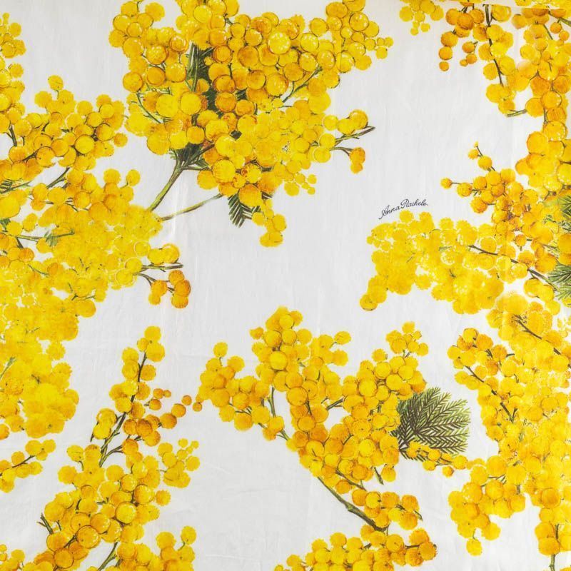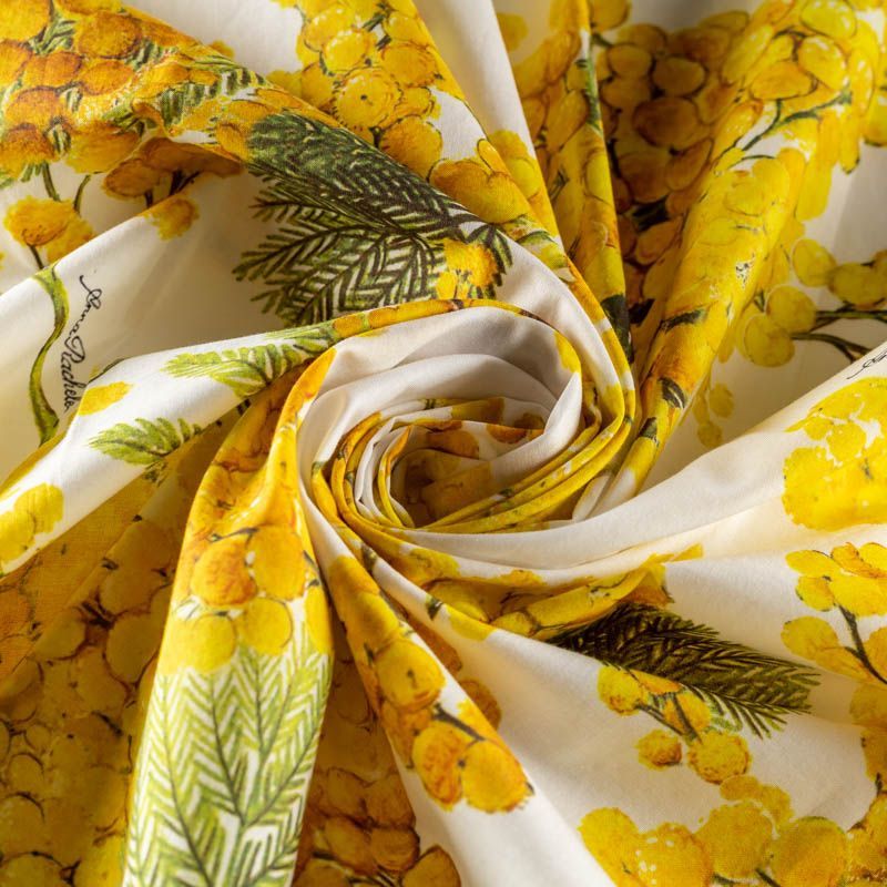 Ткань прозрачная, приятная на ощупь, нежная, хорошо и мягко драпируется, летящая. Хлопковый батист подойдёт для модных блуз с объёмными рукавами, летних платьев и сарафанов с длинной летящей юбкой, прозрачных рубашек, декорированных объёмными бантами. Яркий весенний принт в виде веток цветущей мимозы в солнечно желтых и зеленых оттенках на молочном фоне.
