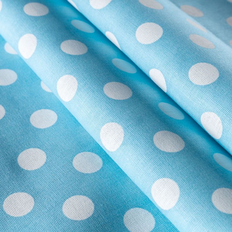 Плотная натуральная ткань с особым принципом переплетения нитей: крест-накрест. Имеет гладкую матовую поверхность чуть шероховатую на ощупь, не тянется, немного просвечивает. Прочная и стойкая к износу, надолго сохраняет яркость красок, не растягивается при стирке, практически не мнется. Принт в белый горошек среднего размера (1,5 см) на голубом фоне прекрасно подойдет для пошива постельного белья, изготовления пеленок, бортиков для кроватки, домашней одежды и других предметов интерьера.