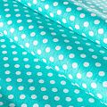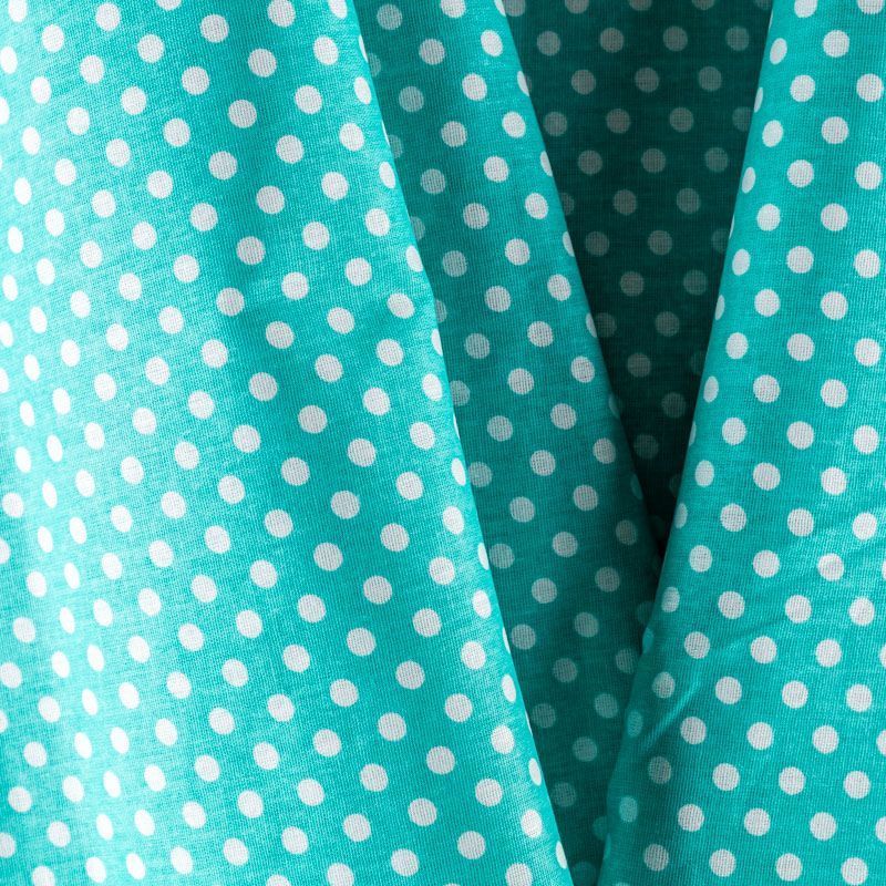 Плотная натуральная ткань с особым принципом переплетения нитей: крест-накрест. Имеет гладкую матовую поверхность чуть шероховатую на ощупь, не тянется, немного просвечивает. Прочная и стойкая к износу, надолго сохраняет яркость красок, не растягивается при стирке, практически не мнется. Мелкий белый горошек (5 мм) на ярком бирюзовом фоне прекрасно подойдет для пошива постельного белья, изготовления пеленок, бортиков для кроватки, домашней одежды и других предметов интерьера.