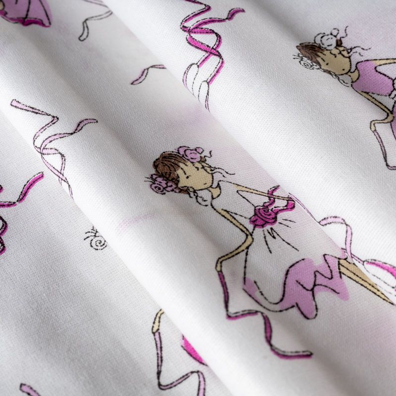 Плотная натуральная ткань с особым принципом переплетения нитей: крест-накрест. Имеет гладкую матовую поверхность, немного шероховатая на ощупь, не тянется, немного просвечивает. Прочная и стойкая к износу, надолго сохраняет яркость красок, практически не мнется. Милый детский принт в виде танцующих балерин на белом фоне прекрасно подойдет для пошива постельного белья, изготовления пеленок, бортиков для кроватки, домашней одежды и других предметов интерьера.