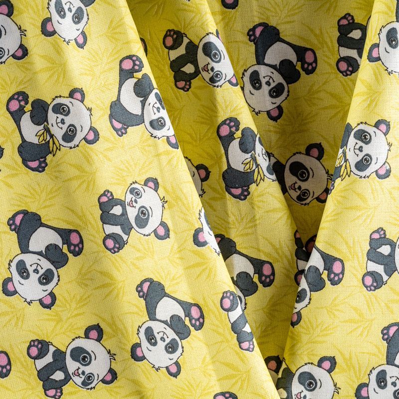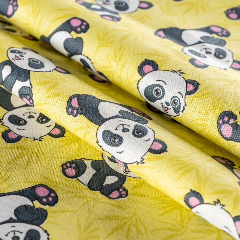 Плотная натуральная ткань с особым принципом переплетения нитей: крест-накрест. Имеет гладкую матовую поверхность, немного шероховатая на ощупь, не тянется, немного просвечивает. Прочная и стойкая к износу, надолго сохраняет яркость красок, практически не мнется. Милый детский принт в виде черно-белых панд на теплом желтом фоне прекрасно подойдет для пошива постельного белья, изготовления пеленок, бортиков для кроватки, домашней одежды и других предметов интерьера.