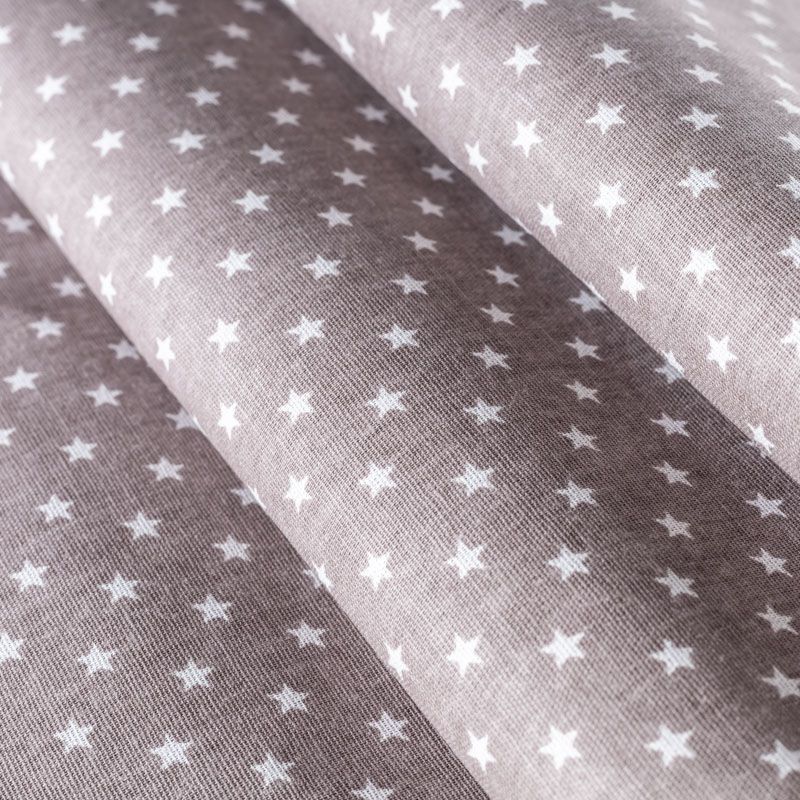 Плотная натуральная ткань с особым принципом переплетения нитей: крест-накрест. Имеет гладкую матовую поверхность чуть шероховатую на ощупь, не тянется, немного просвечивает. Прочная и стойкая к износу, надолго сохраняет яркость красок, не растягивается при стирке, практически не мнется. Принт в виде мелких белых звездочек на фоне серо-бежевого оттенка прекрасно подойдет для пошива постельного белья, изготовления пеленок, бортиков для кроватки, домашней одежды и других предметов интерьера.