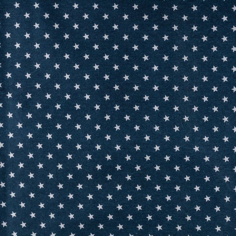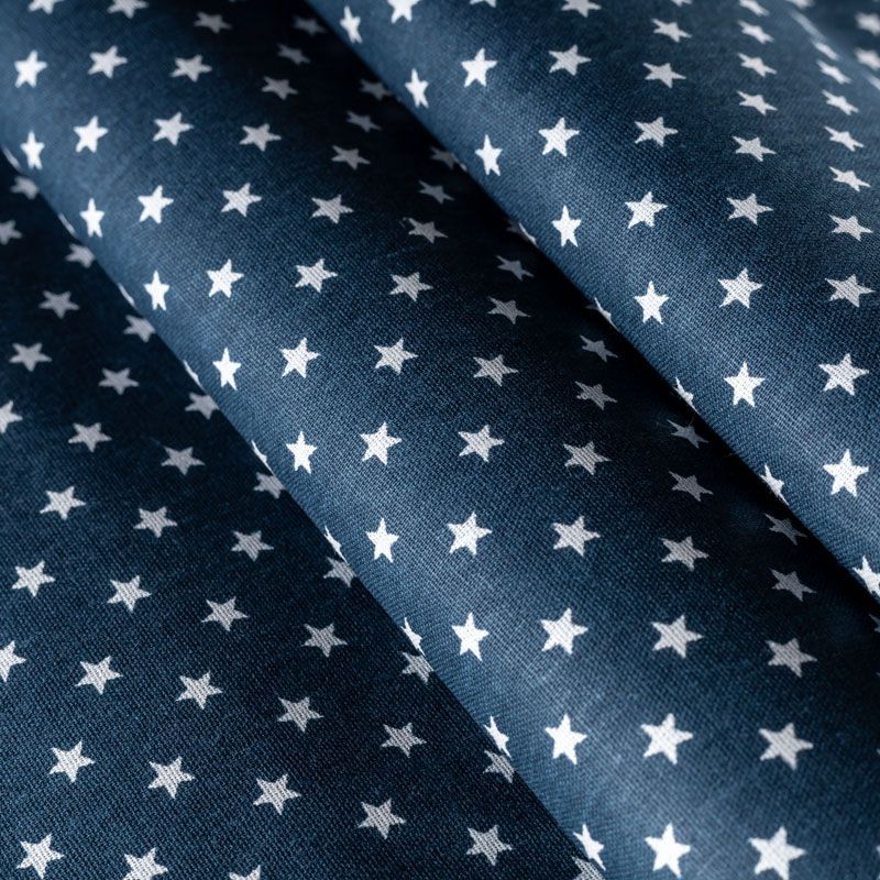 Плотная натуральная ткань с особым принципом переплетения нитей: крест-накрест. Имеет гладкую матовую поверхность чуть шероховатую на ощупь, не тянется, немного просвечивает. Прочная и стойкая к износу, надолго сохраняет яркость красок, не растягивается при стирке, практически не мнется. Принт в виде мелких белых звездочек на темно-синем фоне прекрасно подойдет для пошива постельного белья, изготовления пеленок, бортиков для кроватки, домашней одежды и других предметов интерьера.