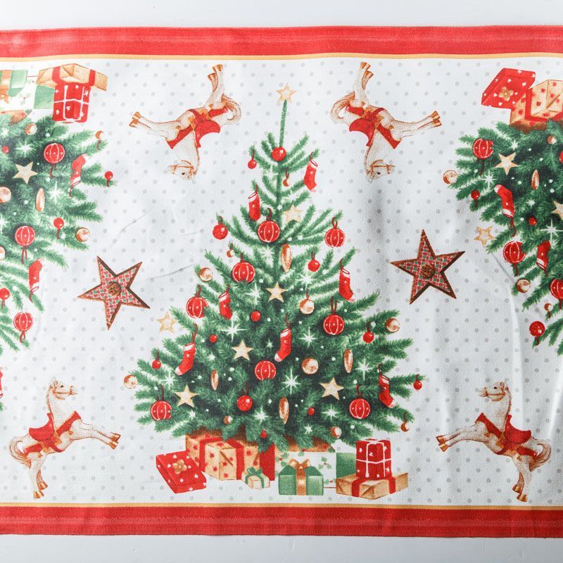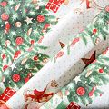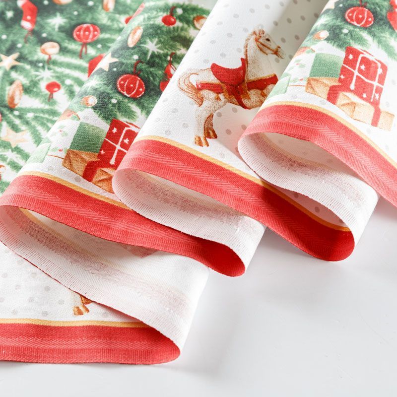 Узкая плотная хлопковая ткань с твидовым плетением елочкой и ярким новогодним принтом. Идельно подойдет для украшения праздничного стола, итерьера, для пошива кухонных полотенец, салфеток, персонников, фартуков, прихваток и т.д.
