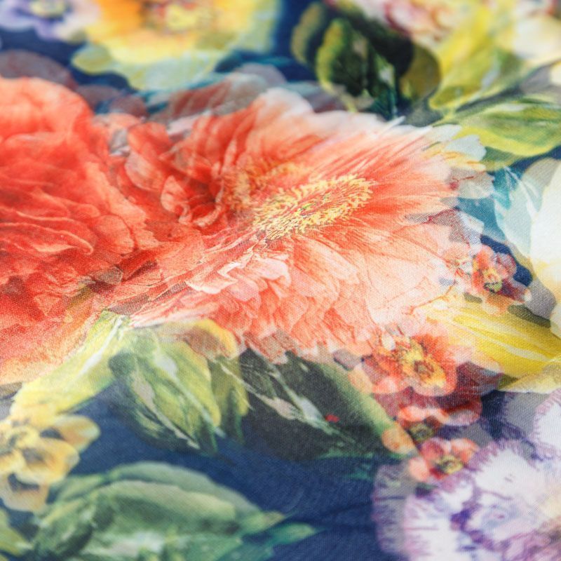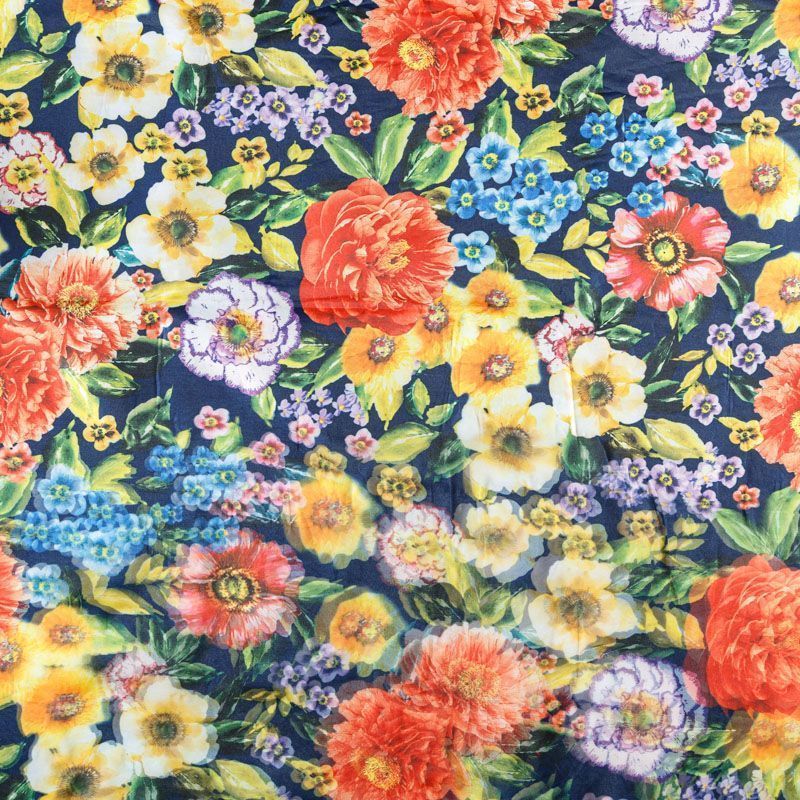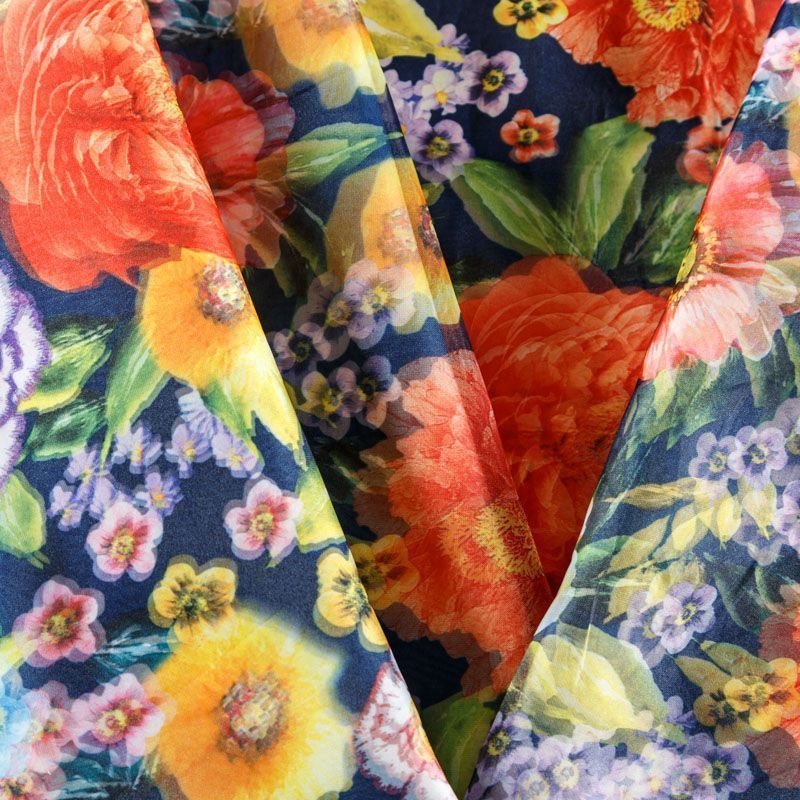 Трикотажное полотно средней плотности с цветочным принтом и слоем органзы. Обе стороны ткани ровные, гладкие. Материал эластичный, имеет растяжимость по всем сторонам, хорошо держит форму, уютный, приятный к телу и удобный в носке. Применяется в пошиве платьев, юбок, костюмов, жакетов.