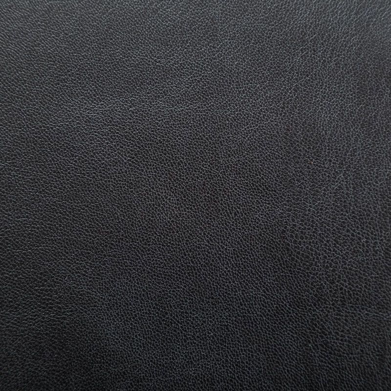 Искусственный материал, имитирующий натуральную кожу черного цвета. Поверхность полуглянцевая, гладкая. Изнаночная сторона с имитацией черной замши. Приятная на ощупь, тянется, не просвечивает, пластичная. Подойдет для пошива куртки, костюма, платья, юбки, брюк, шорт, комбинезона, сумки, рюкзака.
