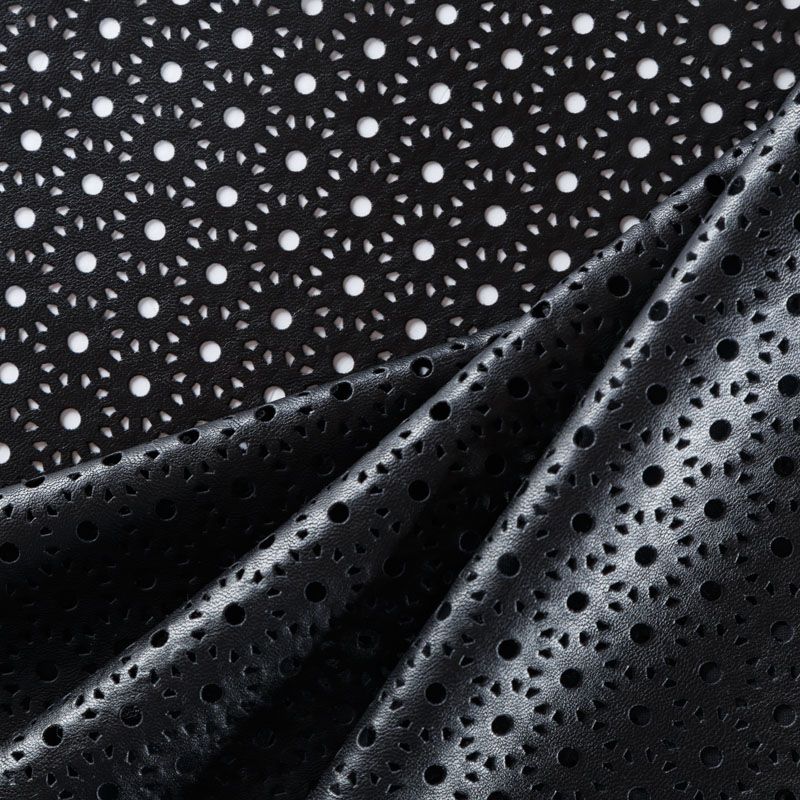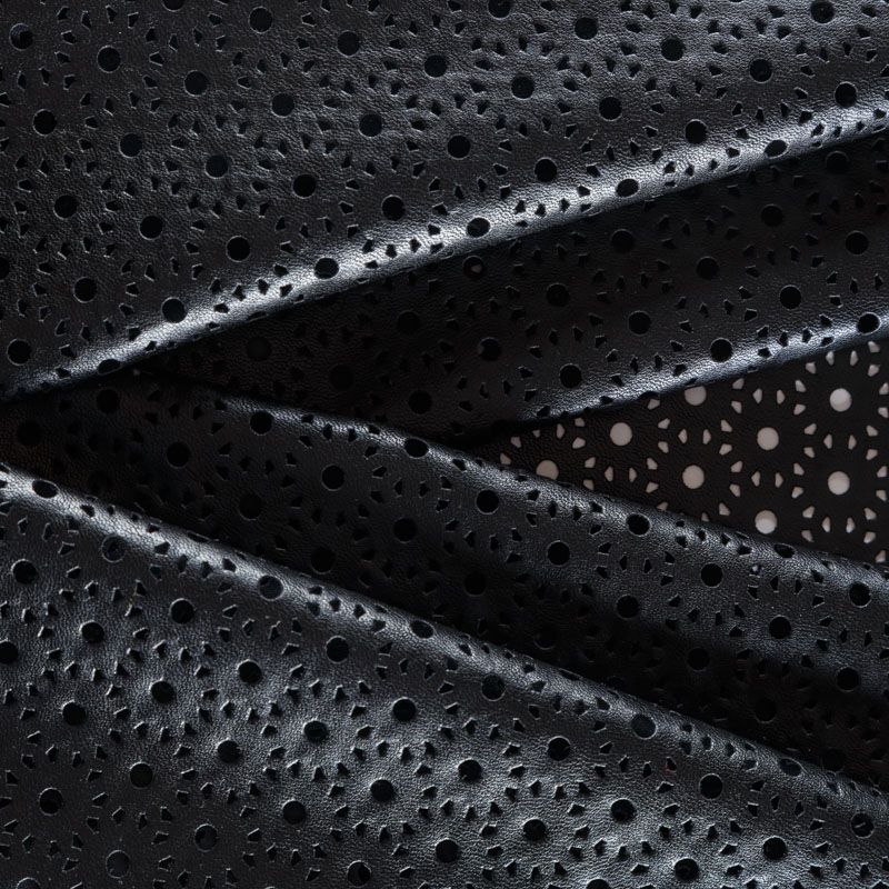 Искусственный материал, имитирующий натуральную кожу, на трикотажной основе. Поверхность матовая, с геометрической лазерной перфорацией. Экокожа тоньше натуральной, не мнется, пластична, тянется, хорошо облегает фигуру. Изнаночная сторона - черный трикотаж. Подойдет для пошива куртки, костюма, платья, юбки, брюк, шорт, комбинезона, сумки, рюкзака.