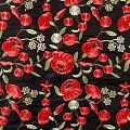 Искусственный материал, имитирующий натуральную кожу черного цвета с богатой объемной цветочной вышивкой в красных оттенках. Поверхность ткани полуматовая, гладкая. Приятная на ощупь, держит форму, не просвечивает, пластичная. Подойдет для пошива куртки, костюма, платья, юбки, брюк, шорт, комбинезона, сумки, рюкзака.