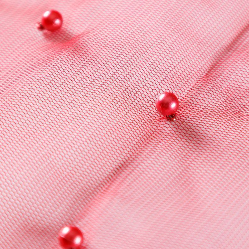 Тонкая прозрачная сетка средней жесткости красного оттенка декорирована не крупными бусинами в тон полотна. Используется для пошива одежды для различных праздников, концертов, пышных юбок, платьев, а также для отделки и украшения, создания предметов декора и украшения помещений для торжественных мероприятий.