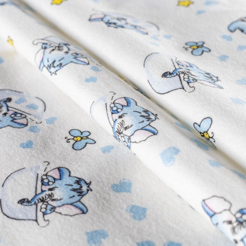 Износостойкий мягкий материал, не раздражает кожу, не садится, отлично впитывает влагу и хорошо удерживает тепло. На лицевой стороне мягкий ворс. Милый детский принт в виде рисованных слоников на белом фоне прекрасно подойдет для пошива постельного белья, изготовления пеленок, бортиков для кроватки, домашней одежды, пижамы и других предметов интерьера.