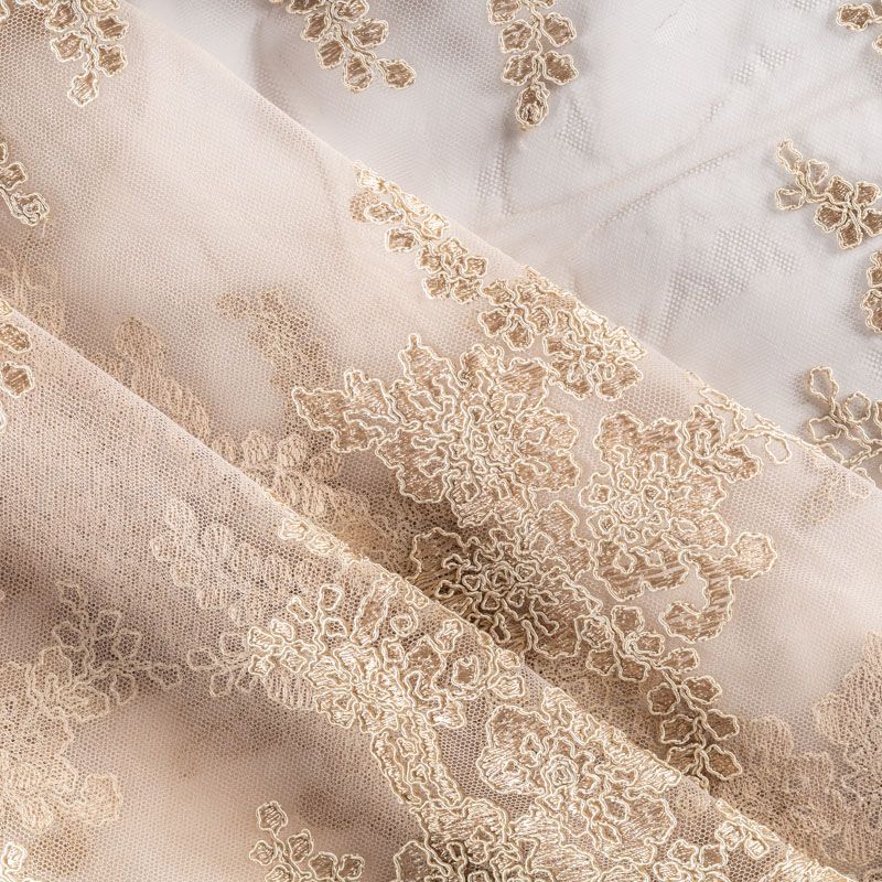 Вышивка на сетке светлого оттенка фисташки с флористическим узором. Полотно мягкое, легкое и пластичное, хорошо тянется. Сетка не жесткая, приятная к телу. Узор вышит мягкой пряжей, образуя красивую фактуру, имитирующую ручную вышивку, и оформлен кордовой нитью. С обеих сторон ткань украшена симметричными фестонами, что придает полотну законченный и нарядный вид. Великолепно будет смотреться в нарядном вечернем платье, платье на выпускной бал, в блузках, топах. Набирается для изделя объемом.