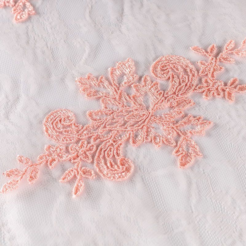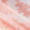 Кружевное полотно на сетчатой жаккардовой основе персиково-розового оттенка с флористическим узором. Тонкое, легкое, очень мягкое и пластичное, хорошо драпируется, приятное тактильно. Вышивка оформлена кордовой нитью. С обеих сторон ткань украшена симметричными фестонами, что придает полотну законченный и нарядный вид. Великолепно будет смотреться в нарядном вечернем, свадебном платье, платье на выпускной бал, в юбках, блузках, топах. Также можно применять отдельные элементы для декора, которые вырезаются из полотна.