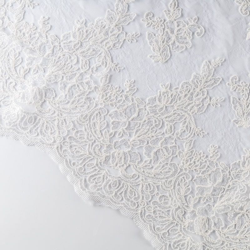 Кружевное полотно на сетчатой жаккардовой основе белого цвета с флористическим узором. Тонкое, легкое, очень мягкое и пластичное, хорошо драпируется, приятное тактильно. Вышивка оформлена кордовой нитью. С обеих сторон ткань украшена симметричными фестонами, что придает полотну законченный и нарядный вид. Великолепно будет смотреться в нарядном вечернем, свадебном платье, платье на выпускной бал, в юбках, блузках, топах. Также можно применять отдельные элементы для декора, которые вырезаются из полотна.