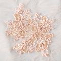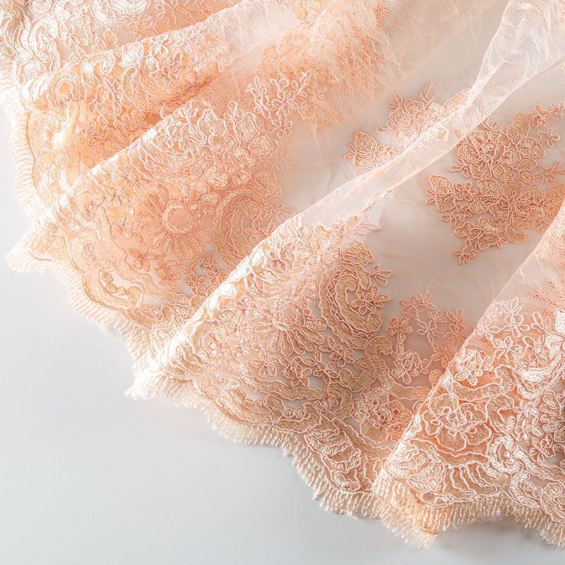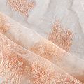 Кружевное полотно на сетчатой жаккардовой основе нежного персикового оттенка с флористическим узором. Тонкое, легкое, очень мягкое и пластичное, хорошо драпируется, приятное тактильно. Вышивка оформлена кордовой нитью. С обеих сторон ткань украшена симметричными фестонами, что придает полотну законченный и нарядный вид. Великолепно будет смотреться в нарядном вечернем, свадебном платье, платье на выпускной бал, в юбках, блузках, топах. Также можно применять отдельные элементы для декора, которые вырезаются из полотна.