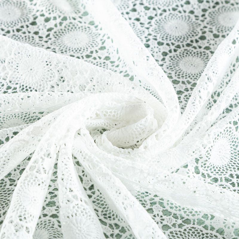 Гипюр-макраме представляет собой ажурное полотно, имеющее рельефную текстуру с цветочным ажурным плетением по всей ширине и фестонами по обе стороны кромок. Материал прозрачный на теле и на просвет, требуется подклад. Всегда актуален при создании утончённых и роскошных нарядов, придавая им дороговизны и оригинальности. Может использоваться для пошива платьев, костюмов прямого кроя, изготовления декоративных элеметов. Набирается на изделие объемом.