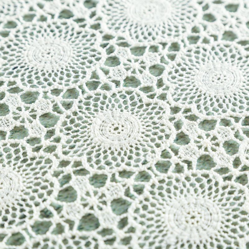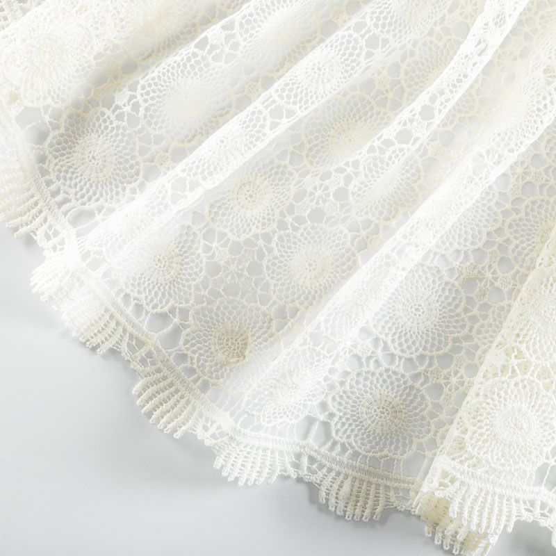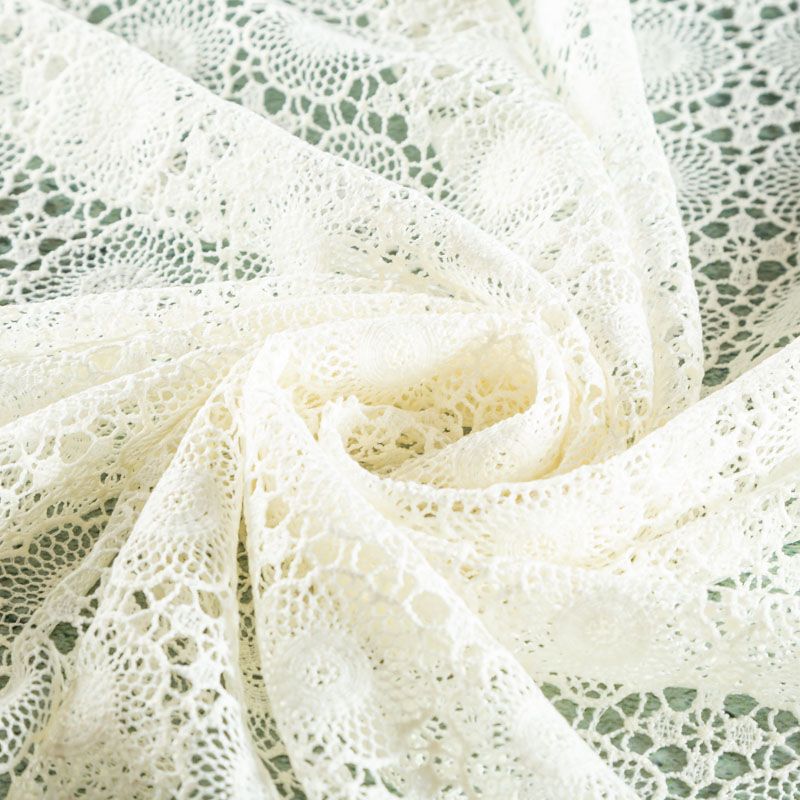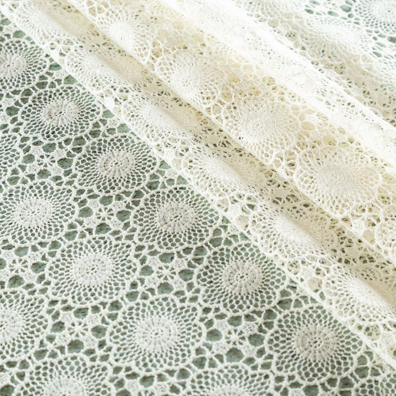 Гипюр-макраме представляет собой ажурное полотно, имеющее рельефную текстуру с цветочным ажурным плетением по всей ширине и фестонами по обе стороны кромок. Материал прозрачный на теле и на просвет, требуется подклад. Всегда актуален при создании утончённых и роскошных нарядов, придавая им дороговизны и оригинальности. Может использоваться для пошива платьев, костюмов прямого кроя, изготовления декоративных элеметов. Набирается на изделие объемом.