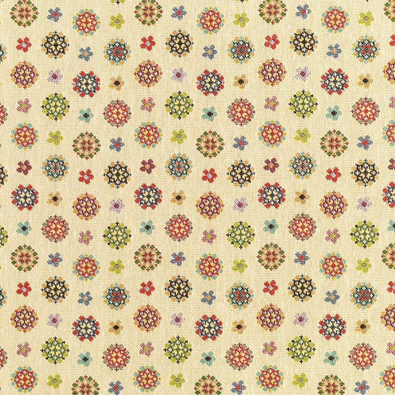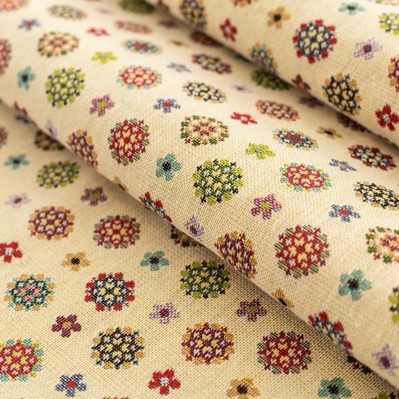 Гобелен представляет собой ткань, выполненную  перекрестным плетением нитей с одномоментным созданием сюжетной или орнаментальной композиции. Это плотный материал высокую прочность и износостойкость. Гобелен используют для пошива плотных светонепроницаемых штор, декоративного домашнего текстиля и аксессуаров, в мебельном производстве для обивки мебели. Так же применяется в рукоделии: модные кошельки, сумочки, пояса и другие аксессуары и при изготовлении дизайнерской одежды. На спокойном песочном фоне цветное разнообразие ажурных снежинок.