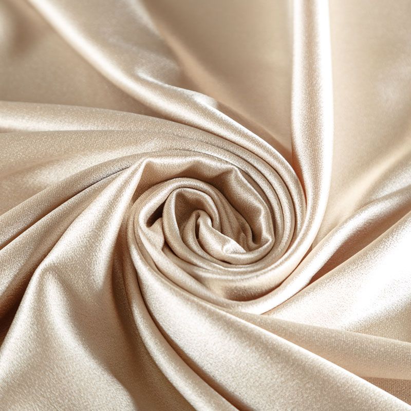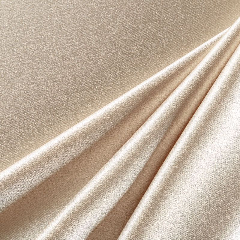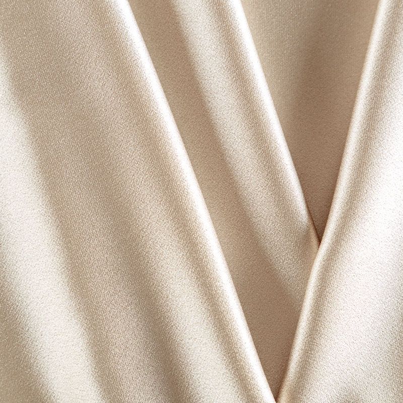 Итальянская ткань кади светло-золотистого оттенка. Кади — это креп-атлас с красивым глянцевым блеском. Ткань с плотной фактурой, роскошно ниспадает, очень хорошо тянется, изумительно садится по фигуре и шикарно смотрится в изделии. Она хорошо драпируется, эффектно облегает. Подходит для пошива удлиненных платьев с драпировками, платья-футляра, брюк палаццо, юбки-карандаш, жакета, туники, кроп-топа, а также для вечерних, свадебных и  выпускных платьев и костюмов.