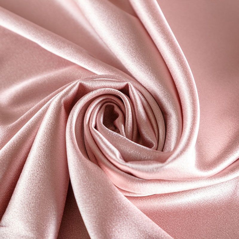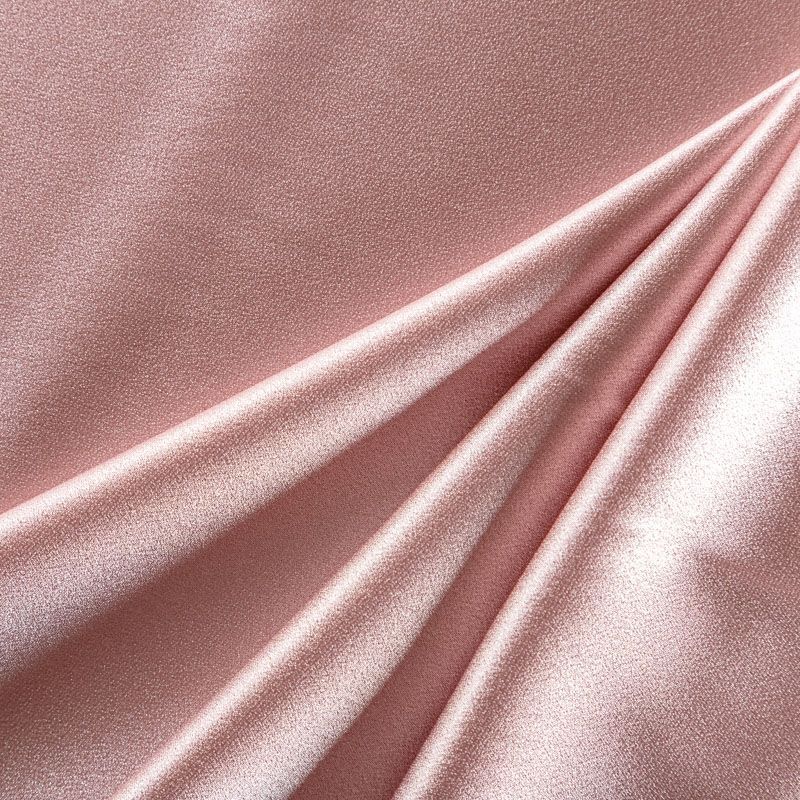 Итальянская ткань кади оттенка розового золота. Кади — это креп-атлас с красивым глянцевым блеском. Ткань с плотной фактурой, роскошно ниспадает, очень хорошо тянется, изумительно садится по фигуре и шикарно смотрится в изделии. Она хорошо драпируется, эффектно облегает. Подходит для пошива удлиненных платьев с драпировками, платья-футляра, брюк палаццо, юбки-карандаш, жакета, туники, кроп-топа, а также для вечерних, свадебных и  выпускных платьев и костюмов.