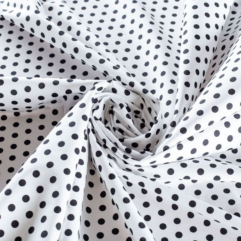 Плательно-блузочная ткань из натурального хлопка с принтом горох. Ткань легкая, тонкая, хорошо "дышит", мягкая, не прозрачная, немного тянется за счет эластана в составе. Подойдет для пошива летнего платья, летящей юбки, блузы, сарафана, комбинезона или рубашки.