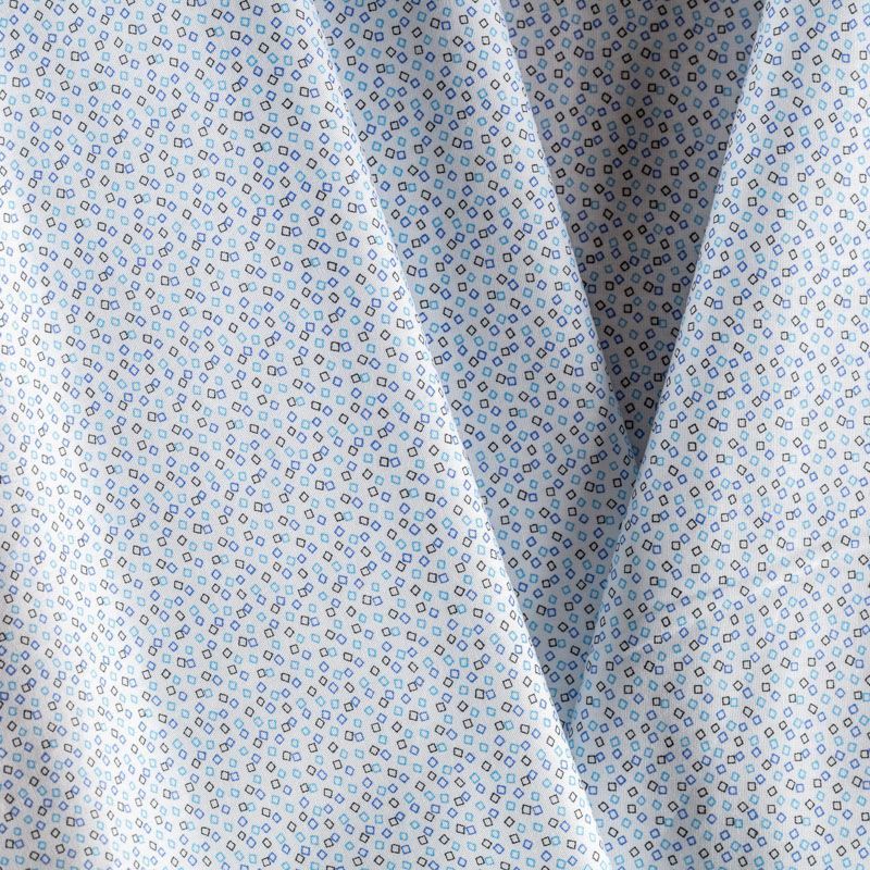Ткань мягкая, тонкая, лёгкая, непрозрачная, поверхность матовая, приятная к телу, хорошо драпируется. По назначению - рубашечная, для юбки, платья, сарафана, туники. На белом фоне мелкий геометрический рисунок голубого, синего и черного цветов.