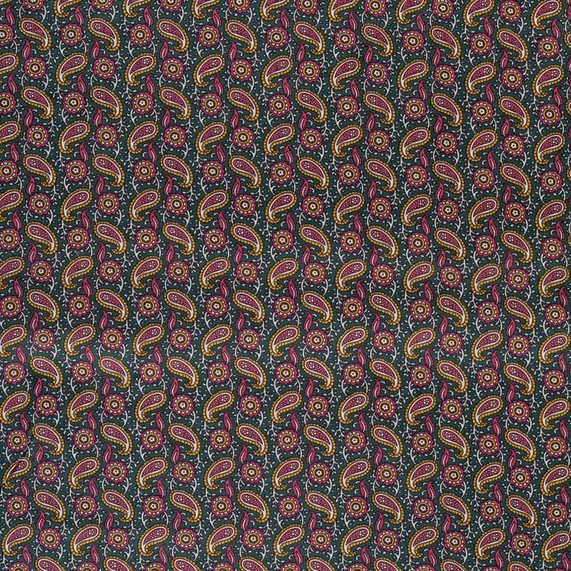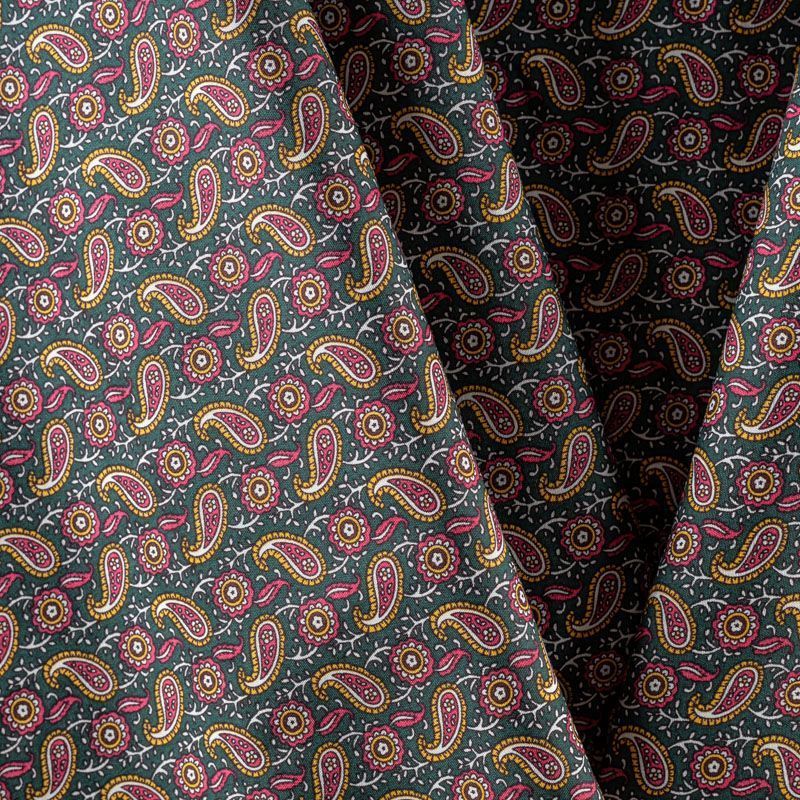 Рубашечно-плательный натуральный хлопок с узором пейсли в розовых и желтых тонах на насыщенном зеленом фоне. Ткань имеет плотное переплетение, матовую гладкую поверхность, хорошо держит форму, не прозрачная. Подойдет для пошива мужских рубашек, платья-рубашки, юбки, сарафана, туники.