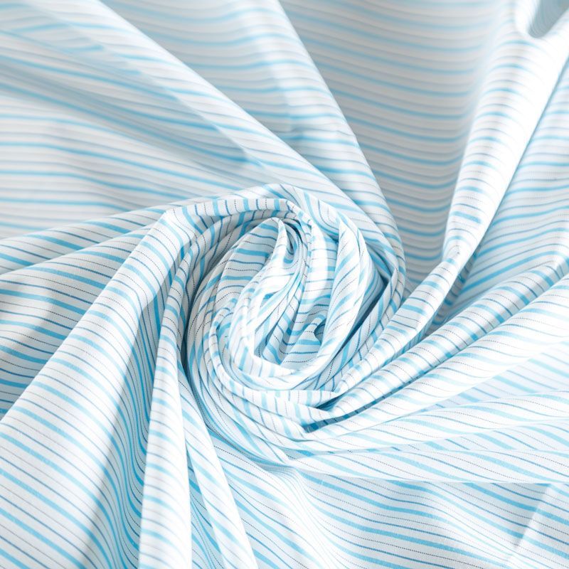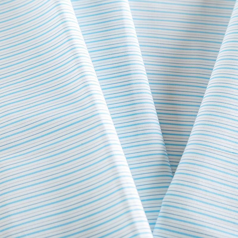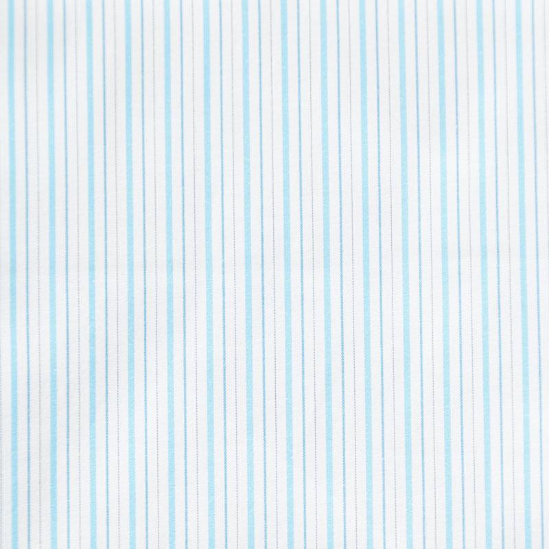 Плательно-рубашечный хлопок в белого цвета в голубую полоску. Ткань мягкая, лёгкая, непрозрачная, пластичная и приятная к телу, хорошо драпируется, имеет гладкую матовую поверхность и сатиновое плетение. Прекрасно подойдет как для пошива платья-рубашки, сарафана, платьев различных фасонов, туники, топа, летнего костюма, комбинезона, мужкой и детской одежды.