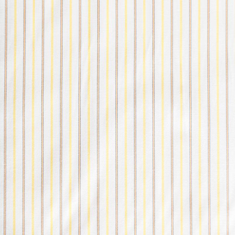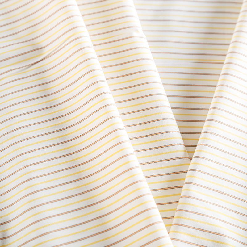 Плательно-рубашечный хлопок в белого цвета в желтую тонкую полоску. Ткань мягкая, лёгкая, непрозрачная, пластичная и приятная к телу, хорошо драпируется, имеет гладкую матовую поверхность и сатиновое плетение. Прекрасно подойдет как для пошива платья-рубашки, сарафана, платьев различных фасонов, туники, топа, летнего костюма, комбинезона, мужкой и детской одежды.