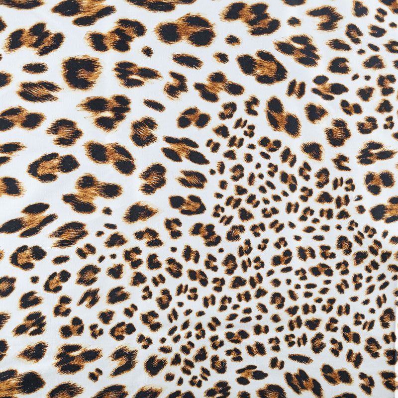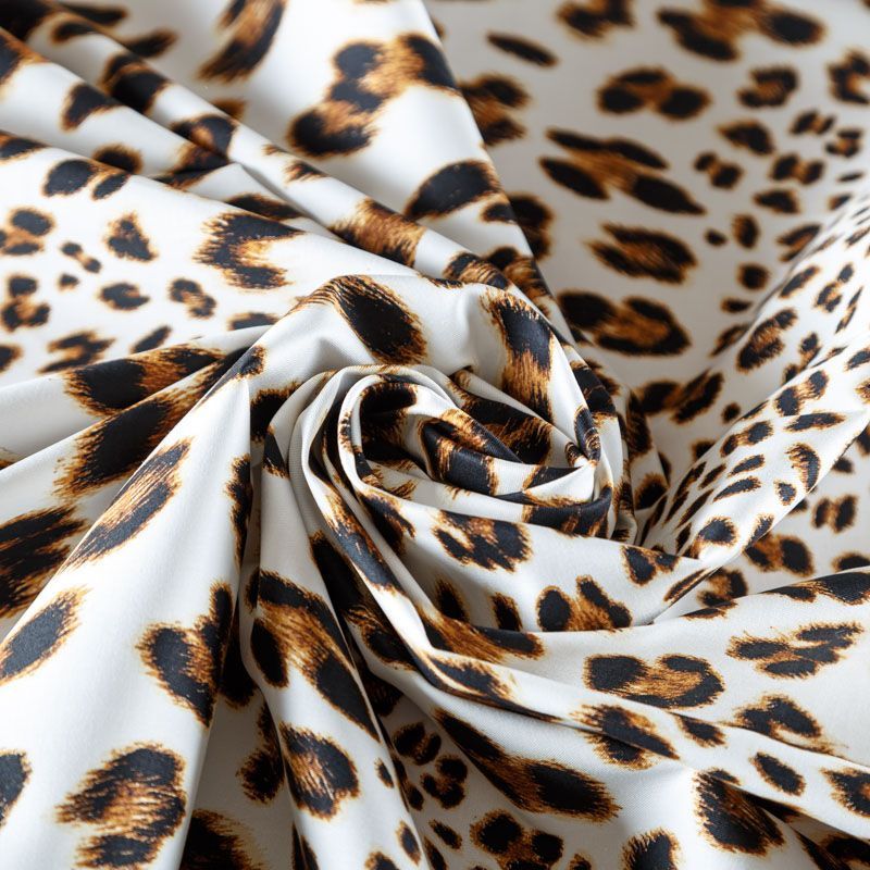 Итальянский коттон белого цвета с анималистическим принтом в природных оттенках. Поверхность гладкая, матовая, ткань средней плотности, не толстая, хорошо держит форму, тянется за счет эластана в составе. Подойдет для пошива костюма, жакета, юбки, платья, брюк или шорт.