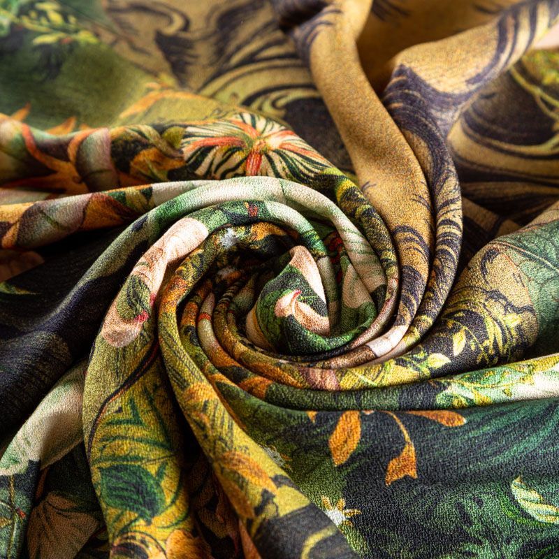 Итальянский креп плательной плотности зеленого оттенка хаки с фантазийным цветочным принтом. Поверхность матовая и фактурная, ткань малосминаемая, тянется за счет эластана в составе, красиво драпируется, струится и дает объемную складку, не просвечивает.Идеально подойдет для шикарного платья, блузы, юбки, комбинезона, брюк свободного кроя.