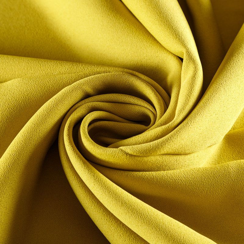 Итальянский вискозный креп костюмно-плательной плотности в сложном желто-зеленом оттенке, поверхность матовая, слегка зернистая. Ткань мягкая, пластичная, образует мягкие фалды, не просвечивает, тянется за счет эластана в составе. Подойдет для пошива весенне-осеннего костюма, платья, комбинезона, юбки, брюк