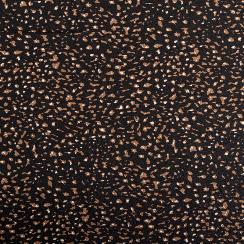 Плательный креп со стилизованным анималистическим принтом на черном фоне, приятный и комфортный в носке, не мнется и не прозрачен на свету, имеет мелкозернистую матовую поверхность, тянется за счет эластана в составе. Идеально подойдет для пошива платья, юбки, широких брюк, комбинезона, блузки, топа или туники.