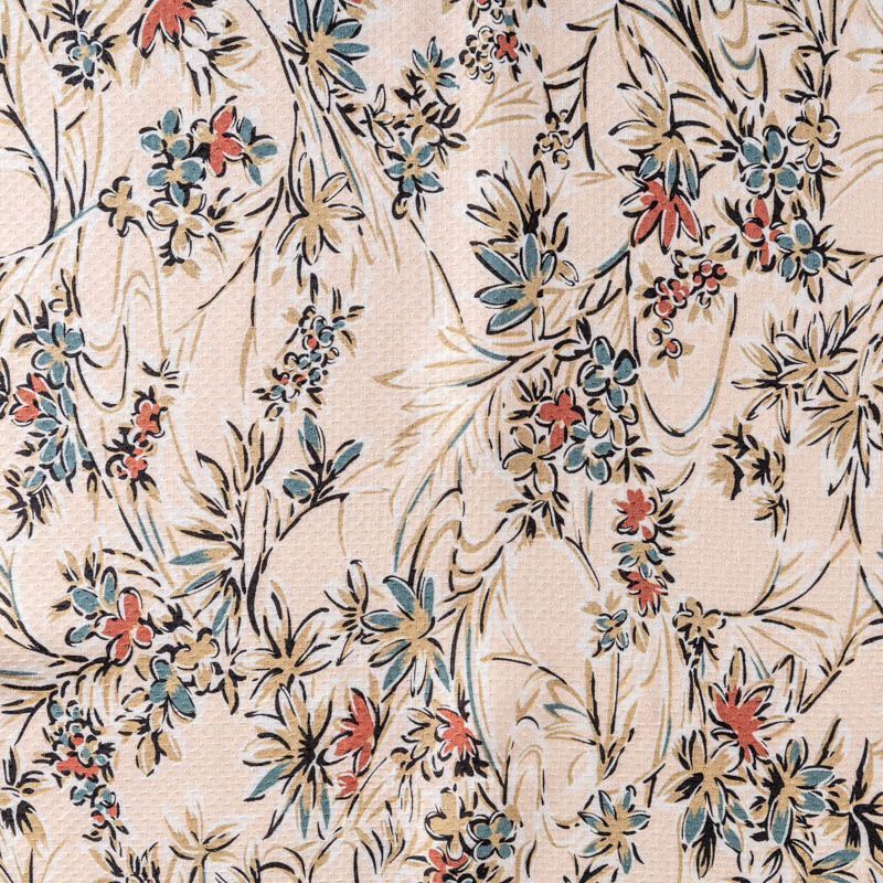 Красивое сочетание оттенков, на сливочном фоне растительный принт в бирюзово-терракотовых тонах. Легкая, пластичная, шелковистая ткань с фактурным мелким узором. Не просвечивается. Мягкая, отлично драпируется и струится. Подойдет для пошива платья и сарафана, юбки, блузки, туники, топа, комбинезона с брюками или шортами, платье-халата.