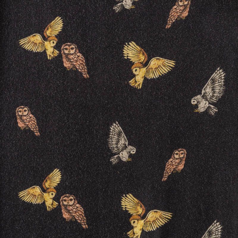 Плотный креп из вискозы с ярким принтом в виде милых совушек на черном фоне. Ткань хорошо держит форму, почти не мнется, имеет заметную фактуру пике и очень прочная - подходит для пошива эффектных бомберов, юбок, платьев в спортивном стиле или легких пальто и жакетов.