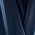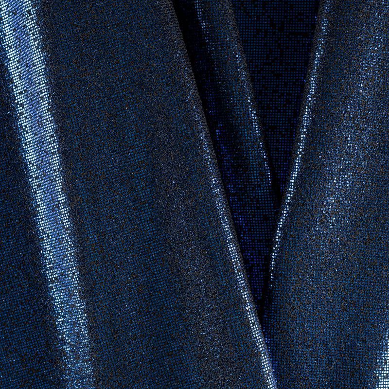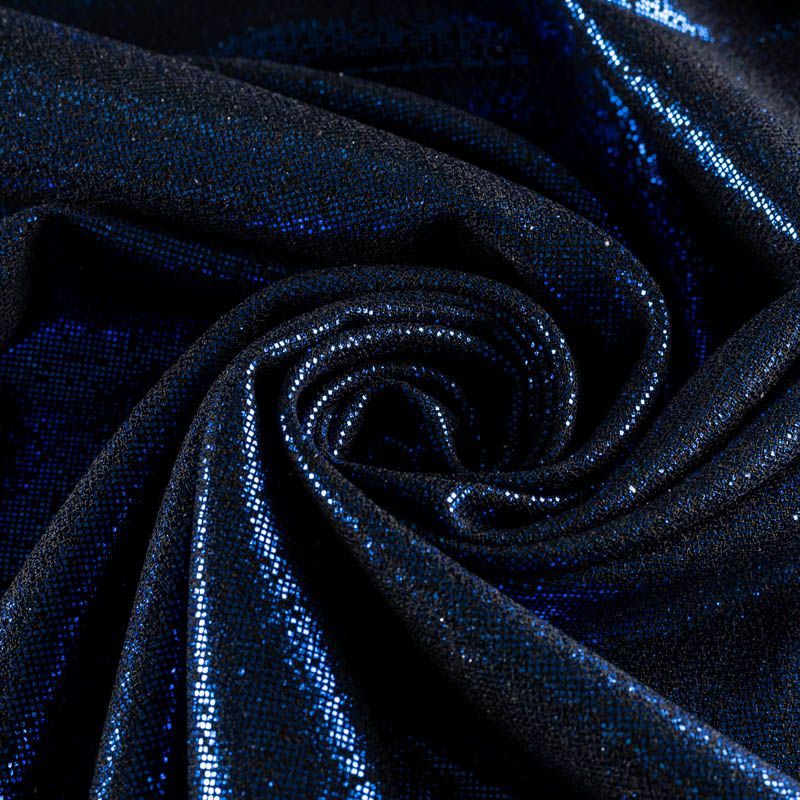 Тонкий и не прозрачный ярко черный шерстяной креп с густым застилом блестящей, искристой, люрексной нити ярко-синего цвета. Ткань нарядная, мягкая, пластичная, слегка упругая. Подходит для пошива лёгкой, нарядной одежды прямых и объёмных силуэтов.