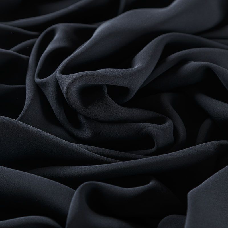 Итальянский шелковый креп черного цвета. Ткань костюмно-плательной плотности, очень пластичная, поверхность матовая, шероховатая, не просвечивает. Идеально подойдет для пошива платьев, юбок, костюма в пижамном стиле, комбинезона.