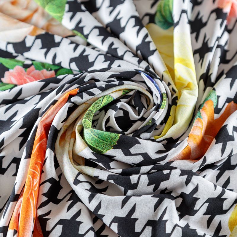 Креп-шифон легкий, воздушный, мягкий и нежный, прекрасно драпируется, тянется, приятен к телу, полупрозрачный, может потребоваться подклад. Поверхность шероховатая, матовая, без блеска. Тянется за счет эластана в составе. Идеален для нежных платьев летящих силуэтов, топов, туник, блузок, юбок с роскошными драпировками и воланами.