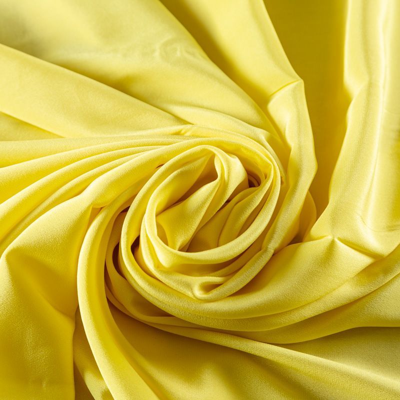 Итальянский натуральный шелковый крепдешин в желтом оттенке, фактурный, легкий и струящийся, слегка просвечивает, отлично драпируется. Идеально подойдет для пошива платьев и сарафанов расклешенных моделей, с воланами, летящих юбок, топов, блузки, юбки, широких брюк, костюма в пижамном стиле.