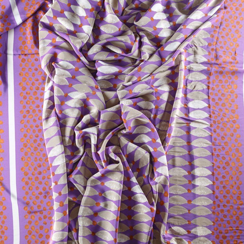 Итальянский натуральный купонный крепдешин с абстрактным принтом на фоне лавандового оттенка, тонкий, слегка прозрачный, отлично драпируется, легкий и струящийся с креповой поверхностью. Идеально подойдет для пошива платьев и сарафанов расклешенных моделей, с воланами, летящих юбок, топов, блузки, костюма в пижамном стиле.