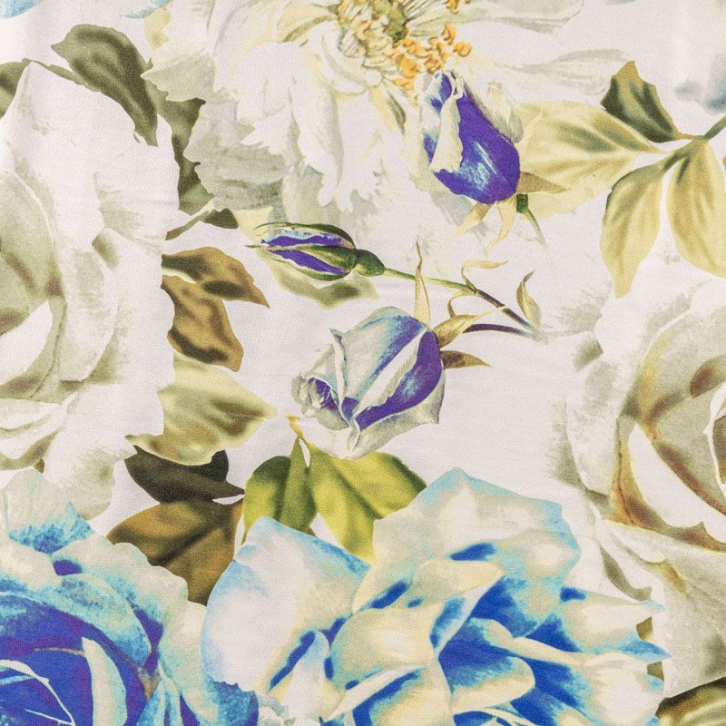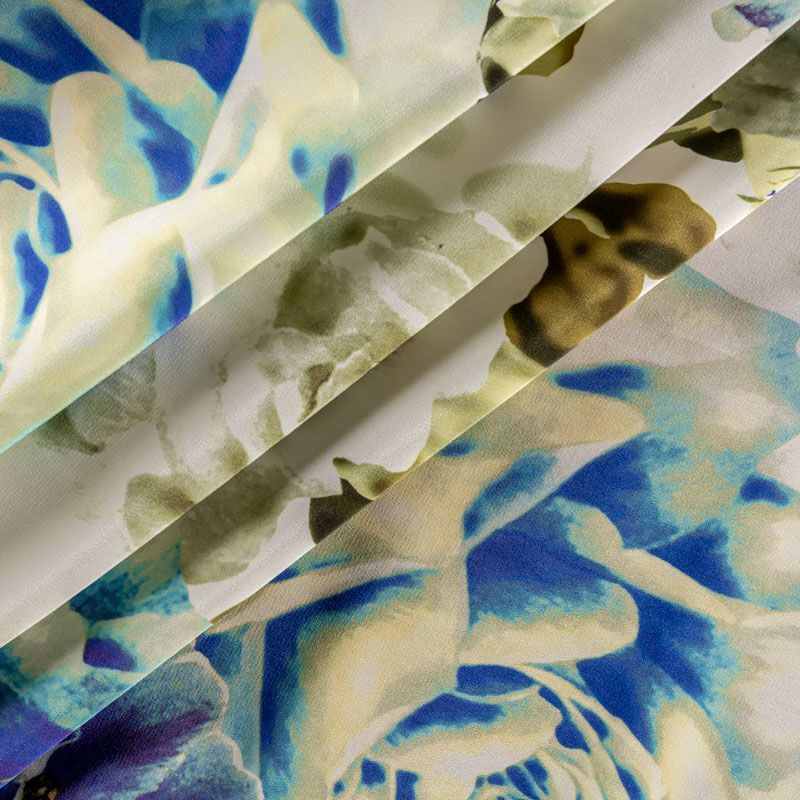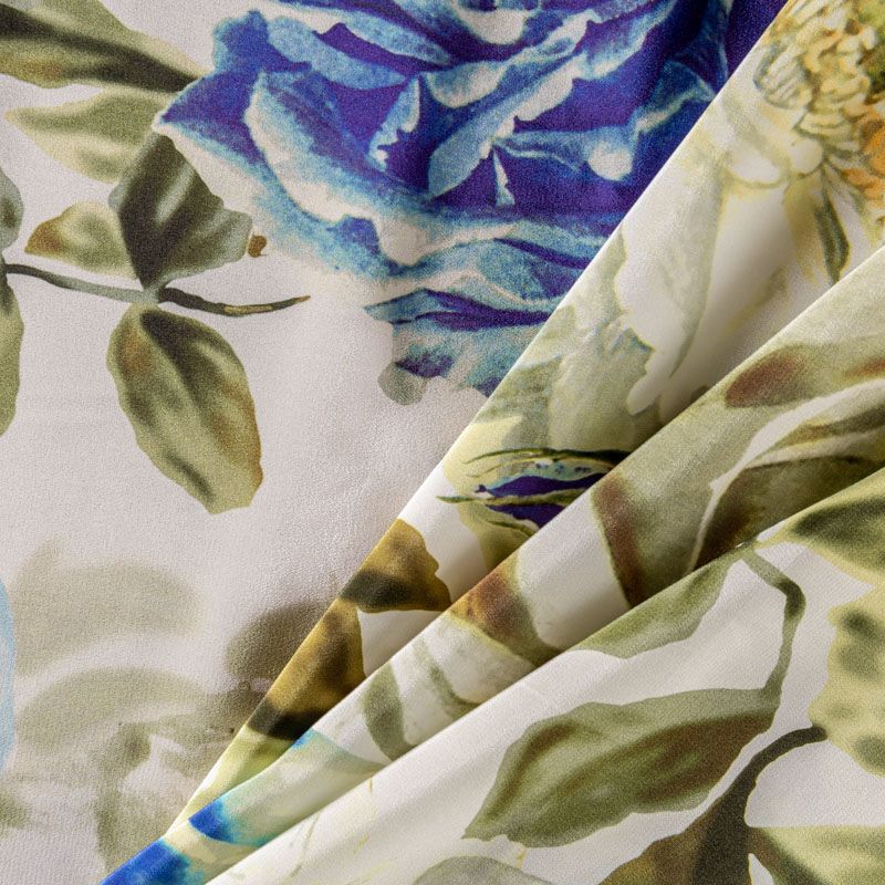 Натуральный шелковый крепдешин с матовой поверхностью, легкий, струящийся, хорошо драпируется. Цветочный принт в сине-зеленых оттенкам будет уместен для пошива летнего сарафана, платья, блузки, костюма в пижамном стиле, широких брюк или юбки.