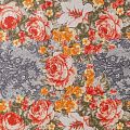 Натуральный шелковый крепдешин с матовой поверхностью, легкий, струящийся, хорошо драпируется. Изысканное сочетание яркого цветочного принта в красно-желтых оттенках с имитацией черного тонкого кружева подойдет для пошива летнего сарафана, платья, блузки, костюма в пижамном стиле, широких брюк или юбки.