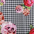 Итальянский крепдешин с матовой лицевой поверхностью с принтом гусиная лапка и цветами, тонкий, слегка прозрачный, отлично драпируется, тянется за счет эластана в составе, легкий и струящийся. Идеально подойдет для пошива платьев и сарафанов расклешенных моделей, с воланами, летящих юбок, топов, блузки, костюма в пижамном стиле.