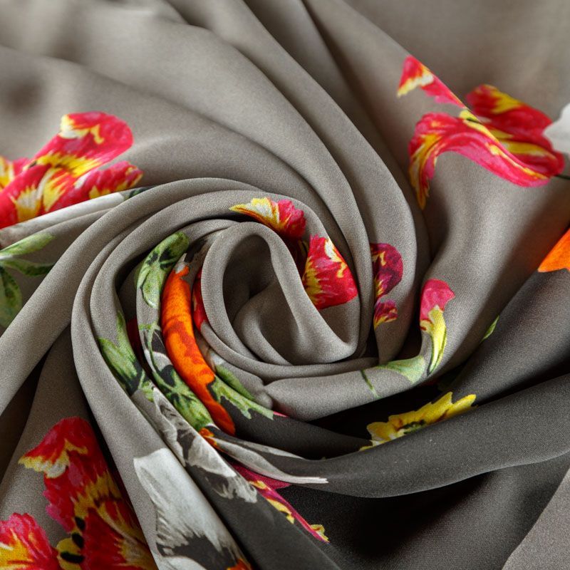 Итальянский крепдешин с матовой лицевой поверхностью ярким цветочным принтом на сером фоне, тонкий, слегка прозрачный, отлично драпируется, легкий и струящийся. Идеально подойдет для пошива платьев и сарафанов расклешенных моделей, с воланами, летящих юбок, топов, блузки, костюма в пижамном стиле.