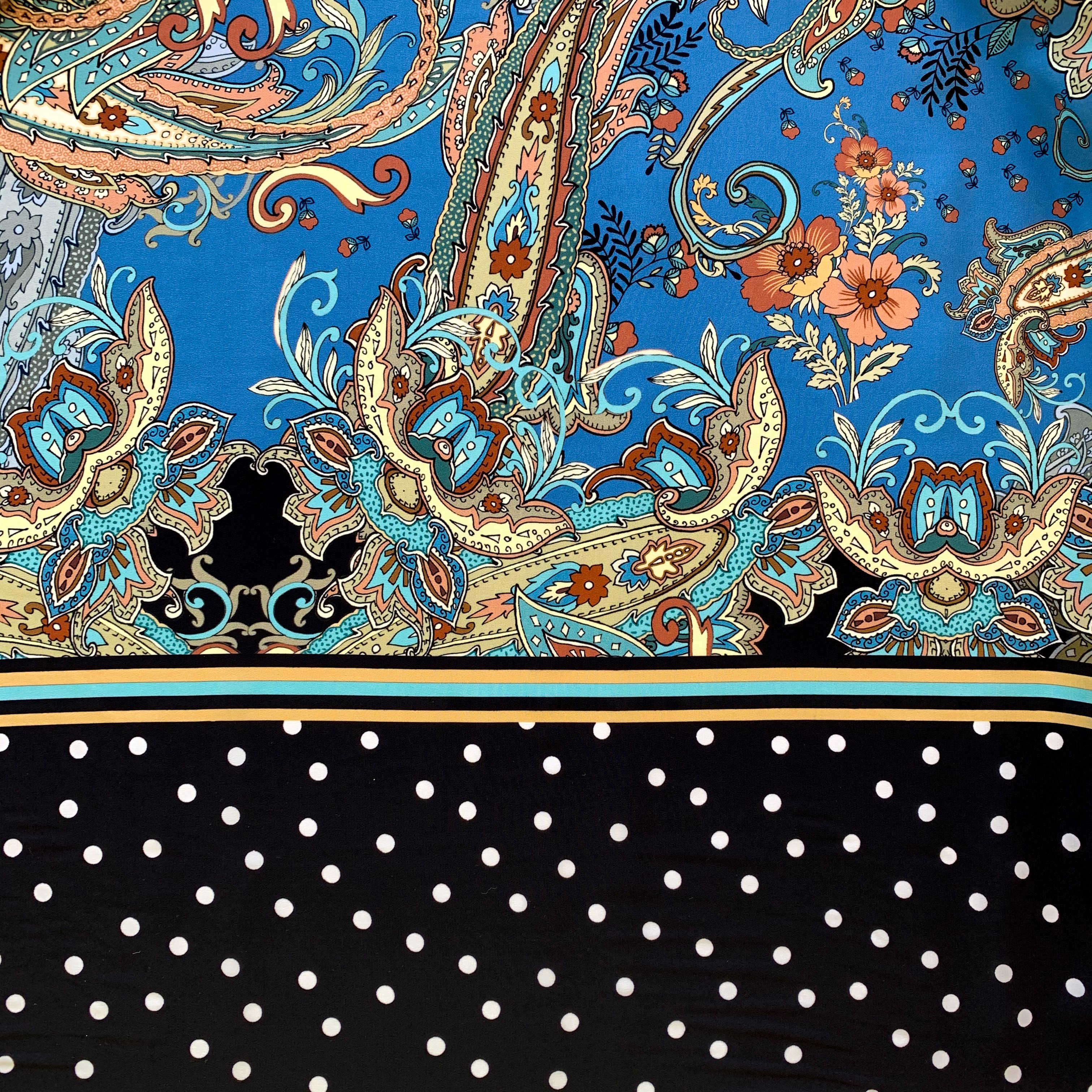 Креповая матовая поверхность, легкий, струящийся, по кромке расположен черный кант в белый горошек, ширина канта - 17 см